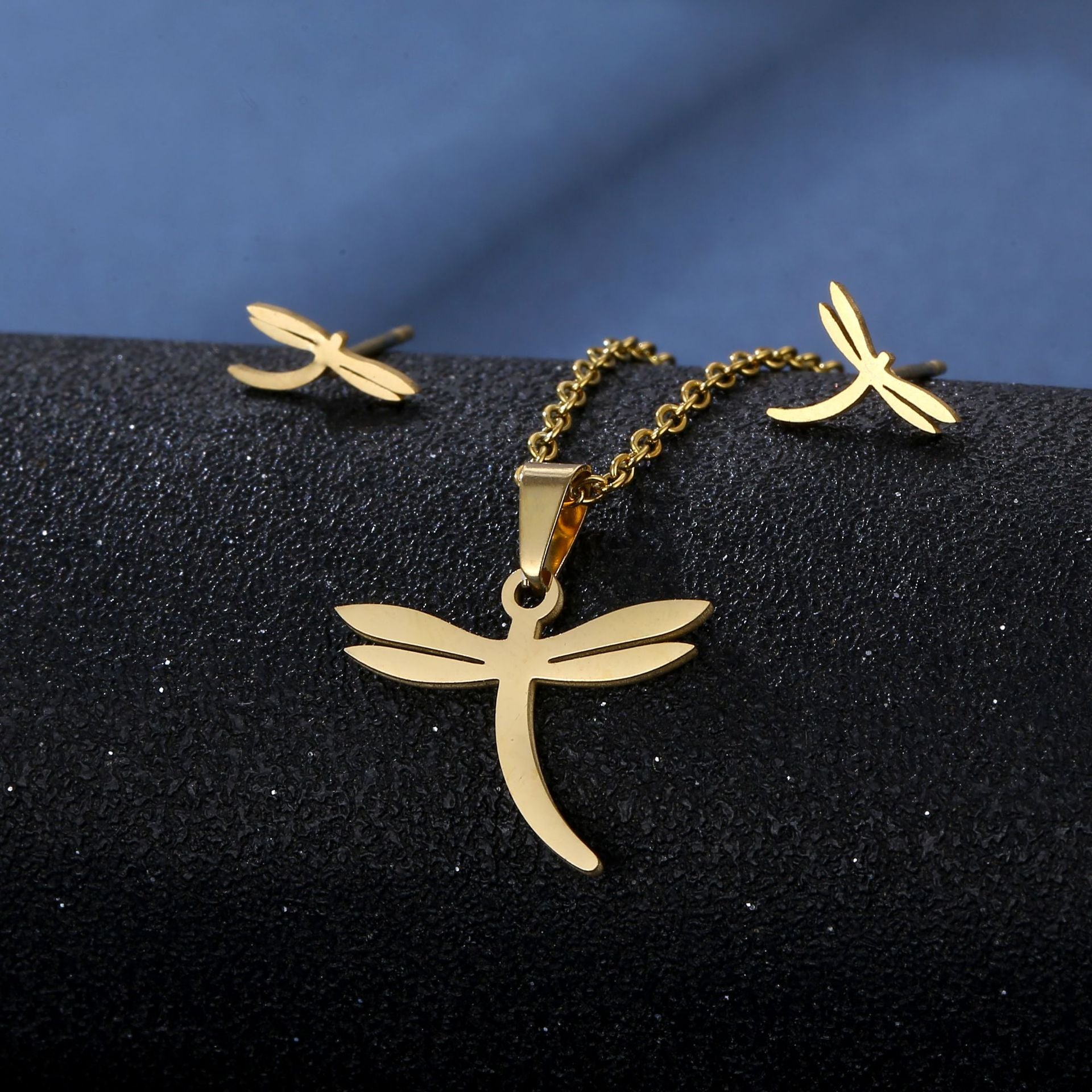 European And American New Dragonfly Pendant Stainless Steel Necklace And Earring Suit